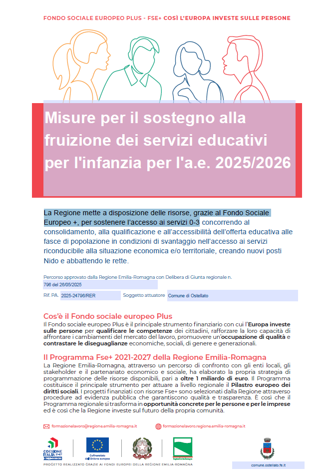 - consolidando i n. 5 lattanti attivati nell’a.e. 2024/2025 e attivando ulteriori n. 2 posti presso il Nido comunale “Arcobaleno”, permettendo così la frequenza di sempre più bambini di età 3/11 e sposando quindi le finalità della Regione Emilia-Romagna e del Fondo sociale europeo Plus di far fronte alla forte pressione sulle liste di attesa per questa tipologia di servizi dovuta alla crescente domanda di servizi conciliativi e opportunità educative di qualità da parte delle famiglie.